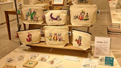 2025年4月16日~4月22日まで高槻阪急3F_アートギャラリー猫ポーチやその他雑貨、猫を描いた原画も並びます。